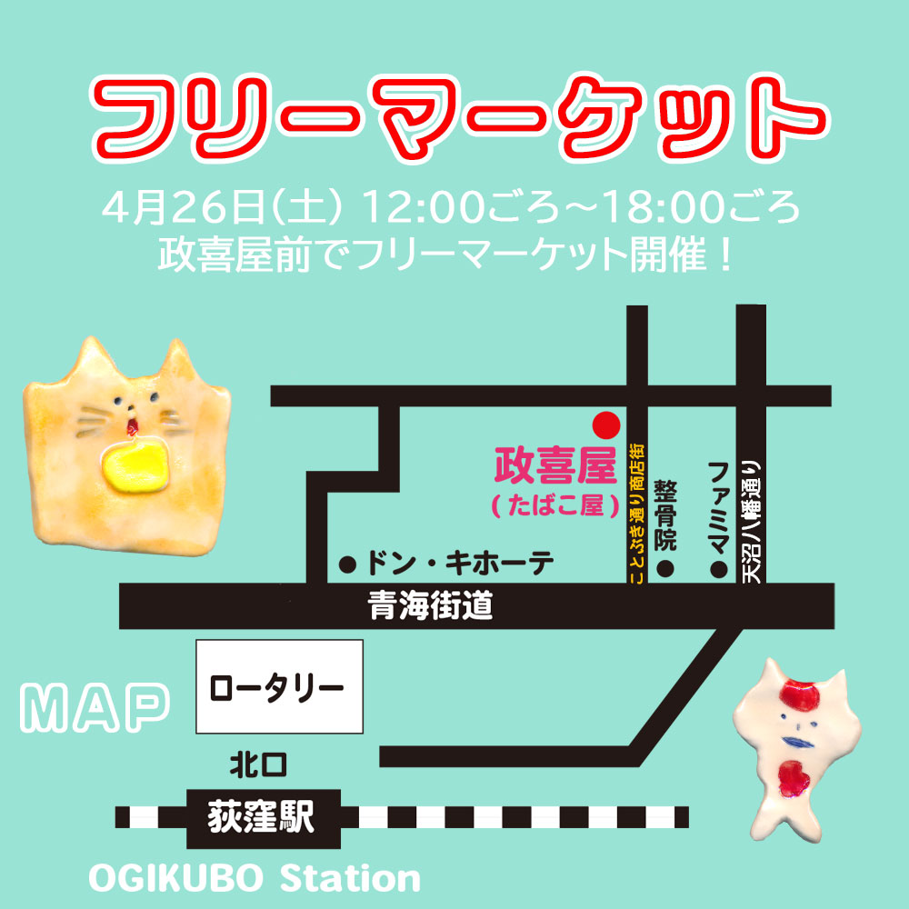 荻窪駅北口にある、たばこ屋さんと陶芸教室もやっている政喜屋さんの店前でのフリーマーケット